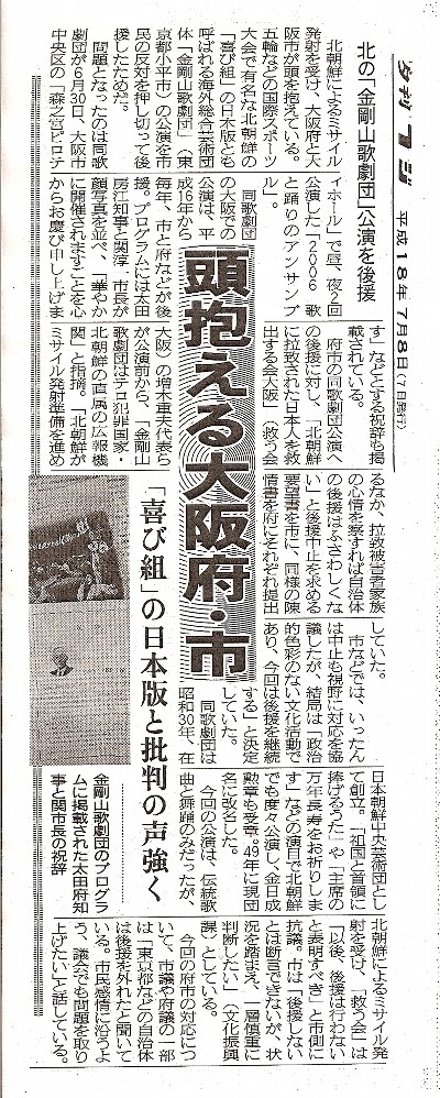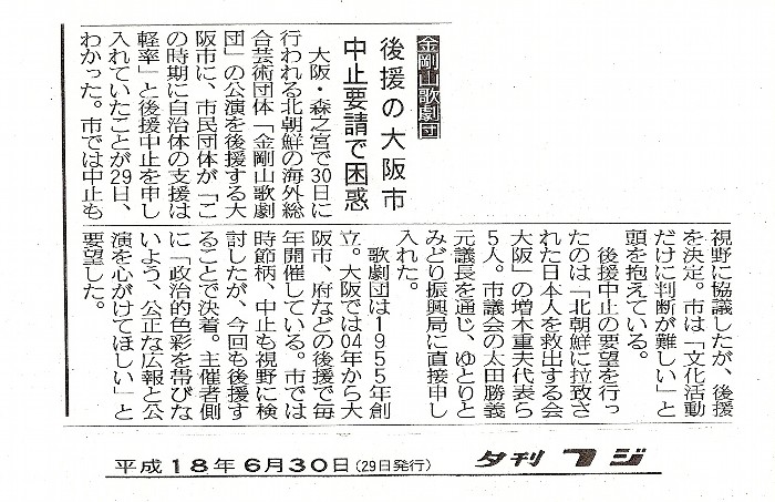 大阪府、市、各教委に対しての公開質問状 公開質問状 今般、大阪府が北朝鮮唯一の海外総合芸術団体、即ちテロ犯罪国家北朝鮮の直属広報機関である金剛山歌劇団の大阪公演にあたり、大阪府名で後援している事に対して質問の申入れをさせて戴きます。 [質問一] 問題の金剛山歌劇団の公演が六月二十九日に、東大阪市で行われ、三十日には大阪市で行われております。 その両方に、大阪府名で後援を行っております。 東大阪市で開催された公演の後援要請を地元東大阪市の自治体は去年から後援を中止しております。 何故、地元自治体の東大阪市が後援を中止しているのに、大阪府名で後援を行ったのか、所見を求める。 [質問二] 北朝鮮に拉致された日本人の救出が未だにされておらず、拉致被害者救出は国民の悲願となっております。 又、現在、北朝鮮は長距離弾道ミサイル「テポドン二号」の発射準備を進めており、アジアを含め世界の各国から脅威と受け止め、非難されているこの時期に、大阪府は何故、北朝鮮直属広報機関に当たる金剛山歌劇団の公演に対する後援を行ったのか、貴殿の所見を求める。 [質問三] 今後、北朝鮮直属広報機関である金剛山歌劇団の公演の後援要請があった場合、貴殿はどの様に対応するのか、所見を求める。 [質問四] 未だに解決出来ていない北朝鮮による拉致事件、そして被害者家族や国民が拉致事件の解決を願い経済制裁をといった声が上がる中、犯罪国家北朝鮮の直属広報機関主催による公演に、対して貴殿はどの様な気持ちで祝辞を送られたのか、所見を求める。 以上 尚、回答は二週間以内にメール又は、返信用の切手を同封しておりますので、書面にて郵送して頂きますよう御願い致します。 皇紀二千六百六十六年 平成十八年 文月 五日 日本民族行動会議 議長 細田政一 〒五五三-〇〇〇一 大阪市福島区海老江一-六-十三-二〇四 電話(〇六)六四五八-〇一一五 FAX(〇六)六四五八‐〇〇〇八 http://hccweb5.bai.ne.jp/koudoukaigi/ E-mail:koudoukaigi@hcc5.bai.ne.jp 大阪府知事 太田房江殿 〔大阪府教委、大阪市、同教委あては同文にて略〕 大阪府、市、各教委からの回答 〔大阪府〕 大阪府知事 太田房江 公開質問状に対する回答について 時下、ますますご清祥のこととお喜び申し上げます。 日頃から、本府文化行政に対し、ご理解、ご意見をいただき、ありがとうございます。 さて、平成18年7月5日付けでいただきましたご質問について、下記のとおり回答します。 記 北朝鮮による拉致の問題は、拉致被害者の方々とその家族の基本的人権を踏みにじる重大な人権侵害であり、一日も早い解決がなされることを願うとともに、解決に向け最大限努力したいと思っています。また、去る7月5日の北朝鮮のミサイル発射は、わが国の安全と国際社会の平和を脅かす行為で、誠に遺憾に思っています。 一方で、本府は、文化振興を図るため、芸術関係の団体等が主催する事業について後援を行っています。これは、当該団体が府民の芸術文化の普及向上に貢献し、過去において十分な実績を有し、事業の目的が芸術文化の普及向上に寄与するものであり、かつ、開催場所が公衆衛生、災害防止について十分な設備及び措置が講じられているなどの承認基準を満たしていれば、「事業実施に際しては、文化の向上に寄与するよう留意し、営利を目的とするような行為をしないこと。」などの使用条件を付して、後援名義の使用承認を行っているものです。 ご質問の去る6月30日、森之宮ピロティホールにおいて開催された金剛山歌劇団大阪公演実行委員会主催「金剛山歌劇団大阪公演(歌と踊りのアンサンブル)」公演につきましては、その事業目的において、「在日同胞の民族的自覚啓発と文化的素養の向上、朝・日両国の文化交流、相互理解、友好親善を深める。」となっており、公演内容も歌と踊りを中心に芸術性が認められました。また、過去10年間において毎年のように公演を行い、平成16年度から承認の条件に基づき実地検査を行っていますが、政治的活動や北朝鮮を賛美するような内容も無く、承認基準等の違反は認められませんでした。このように申請内容が、府の承認基準に適合しているものと認められましたので、後援名義の使用を承認したものです。 なお、6月29日の公演に関しましては、後援名義の使用承認はいたしておりません。 また、知事挨拶につきましては、原則として、後援名義の承認事業を主催する団体等からの依頼があった場合、応ずるものとしています。 最後に、今後、同様の申請があった場合は、府の承認基準に照らし、申請書等について、慎重に審査のうえ、承認、不承認の判断をしてまいります。 〔大阪府教委〕 教育長 竹内 脩 公開質問状に対する回答について 日頃から、本府教育行政に対しご理解並びにご意見をいただき、ありがとうございます。 まず、ご指摘の北朝鮮による日本人拉致事件につきましては、重大な人権侵害であると認識いたしており、一日も早い
