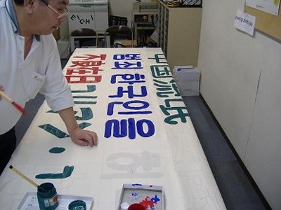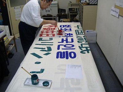 PCで型を取ってコピーで引き伸ばす。アクリルカラーで字を書く。たいへんなんです。1枚4〜5時間はかかるかな。