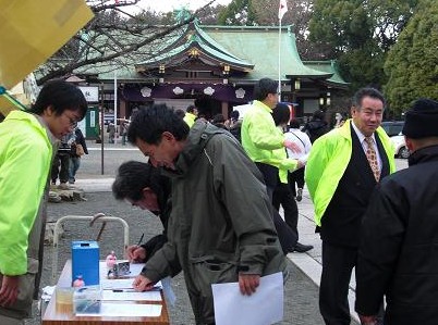 | 荒巻隊員、今年も何があっても「国旗」を死守! | 正殿前で早速署名開始。 マスキクン、正月と盆はネクタイ着用。 | ||||||