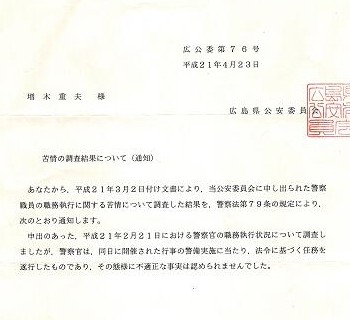 平成21年2月21日、朝9時半頃、我々7名は広島市内、平和公園東側、元安橋東詰東方30m付近で、福岡県警(隊長は「北九州の佐々木」と名乗る)のマークの入った機動隊の制服を着た警察官から進行を阻まれ、他の一般人は通行しているにもかかわらず、我々は平和祈念資料館にいけず、我々の「見学したい」という細やかな人権が著しく傷つけられました。どのような法的根拠によって我々だけが平和公園に入れなかったのか説明していただきたいと思慮します。 |