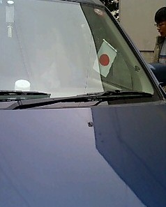 進。東側から入ろうとしました。今地図を見ると、元安橋から入ろうとしたようです。車は元安橋東詰めに着きました。ところが公園内は車では入れないと警戒中のおまわりさんから言われ、橋の近所の駐車場に入れるよう指示されました。そこで車から降りるものやら残るものが話しているとき、警戒中のおまわりさんから「職務質問」を受けました。警察官は運転をしていた荒巻君にいろいろ話し始めました。そこで私は我々だけに職務質問をしているので不思議に思い、「なぜ我々だけに職務質問するの?」と尋ねると、警察官は「車のフロントに国旗があるからや。」と言います。国旗といってもはがき大。ミニチュアのかわいいもの。私はとっさに、「拒否」。警察官職務執行法には「職