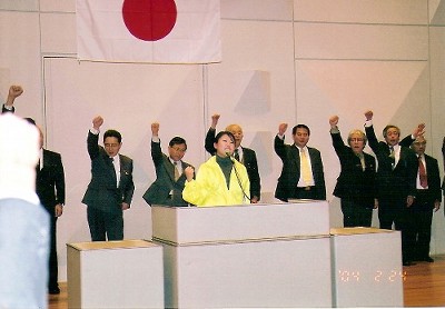 | H16(大2)-2-24 教育裁判を支援する決起集会 左より、大前繁雄衆議院議員、藤岡信勝先生、(故)名越二荒之助先生、 小山和伸先生、小林正先生、長谷川潤先生 |