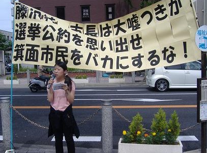 | H20-6-12 「北摂地区市長マニフェストを監視する会」 箕面市役所前 池田、箕面、豊中、吹田市の市長の選挙公約の実現度をチェック。 |