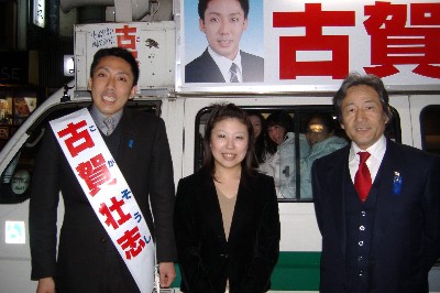 H17(大3)-2-17 古賀壮志日野市議会議員 選挙事務所前にての初陣!オジャマムシは古賀俊昭パパ(東京都議) |