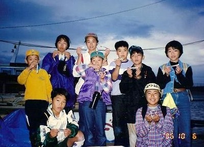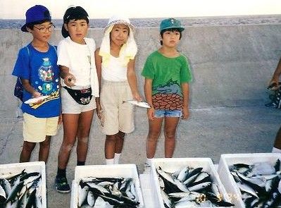 H6-10-9(小5) 武庫川沖防波堤 とにかく釣れた。アジ、さば、イワシ、ムチャクチャ釣れた。学友(?)たちと。 |