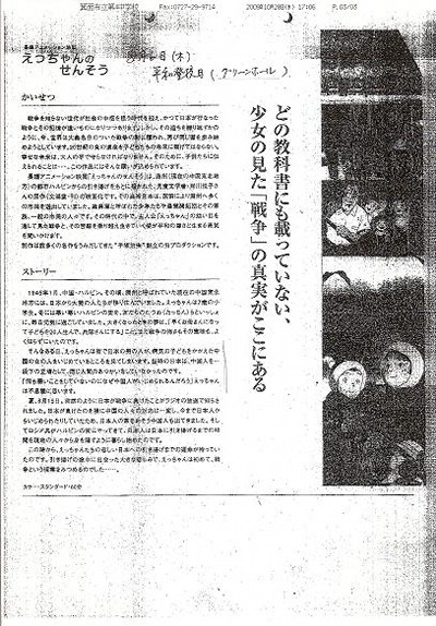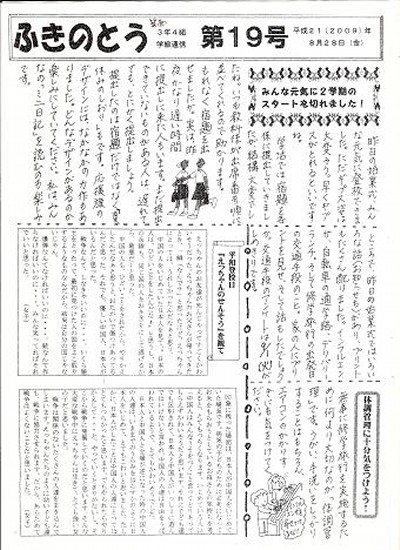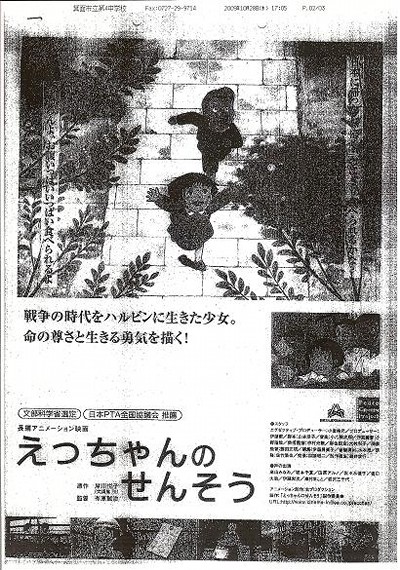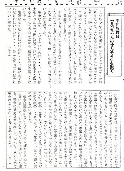 大阪府箕面市立第4中学校では夏休みの平和登校日(8月6日)に、学習の一環として、今年は文部省選定の「えっちゃんのせんそう」というアニメを生徒に視聴させた。そしてその感想文のいくつかを、3年4組の担任が選び学級通信「ふきのとう」19号で取り上げたのである。読んでいただければわかるが、なぜ「日本人が中国人にひどいことをした。」と言うものばかりを取り上げるのだろう。他に作文はないのか。聞くところによると、この「えっちゃんのせんそう」はそんなに偏向はきつくなく、ロシアの横暴なども出てくるとか。 私は偏った編集から偏向授業が容易に推測でき、そこに反日を目的とした恣意的なものを感じ、箕面市教委に抗議に出向いた。そして「ふきのとう」1年分全巻を見たいと申し出た。11月20日、それを見に行った。そうすると、19号は序の口で、卒倒するようなテーマが発見された。11月20日の記事を参照されたい。 |
