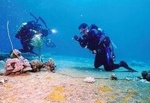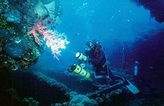 | 「富士川丸」の甲板でソフトコ−ラルにライトを照らすダイバー トラック諸島(現在チューク) |
