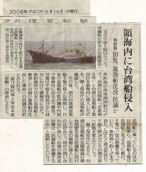 | 6月 1日、尖閣諸島沖で我が国海上保安庁の巡視船と台湾の遊漁船の接触沈没事故がありました。この事故が火種となり、16日には台湾の抗議船10隻が我が国の領海を侵犯しました。 その記事が16日の読売夕刊に写真入で載っています。ところがその写真(海保提供)、侵犯船に中国の五星紅旗が翻っているじゃありませんか。特に船の全部の旗には黄色がうっすらと写っています。また17日朝刊(AP)には青天白日旗が。これ、どういうこと? マスキクンの平和論 日本は平和です。トラブルもほとんどありません。自民と民主が喧々諤々言ってますが、ピストルで撃ち合いしたとも聞いていません。 国土=国民=民族=政府・・・・これが日本です。内閣が一致も不一致も「内閣の半分は帰化人」と言うわけでもありません。国会議員の半分が白人と言うわけでもないのです。これが平和の担保かもしれません。 ところが諸外国、さしずめ台湾。内省人、外省人、高砂族、中国のエージェント『国民党』・・・・台湾の船が日本を領海を侵犯した。ではダメなの? わけがわからりません。 |