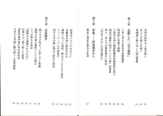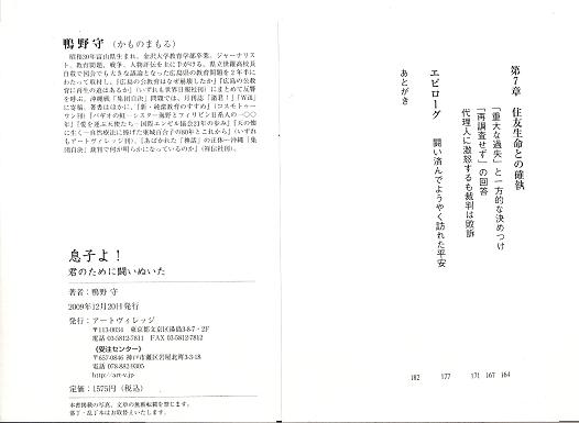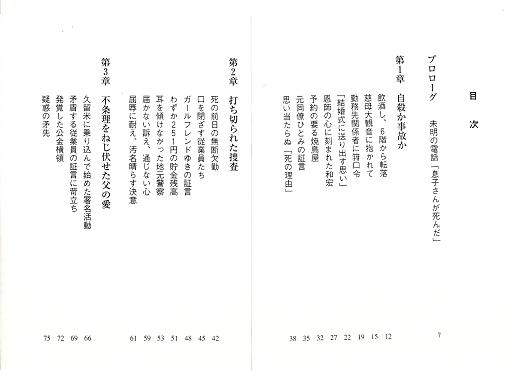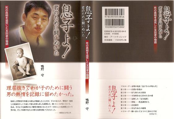 この本は私もいささか関係している。下記、「あとがき」をお読みいただければ「いささか」がお分かりいただけるが・・・・。鴨野氏の文章力に脱帽。 あとがき 本書は、二十一歳のある青年の転落死が、実際には自殺に見せかけた他殺、すなわち殺人 だったとして、遺族や友人等の必死の調査の甲斐あって、事件発生から六年以上も経ってよ うやく容疑者逮捕にまで至った「久留米同僚殺人事件」を扱ったノンフィクションである。 日刊紙「世界日報」平成二十一年五月八日から六月六日まで掲載した記事「息子よ!友田 家・粋のかたち」に大幅加筆を行った。服役中の鈴木行夫以外、実名である。 大阪に住む筆者の友人、増木重夫氏が、この事件の被害者である友田和宏君の死に言及し たメールを配信したのは昨年(平成二十年)四月十四日未明のことだった。 タイトルは「『子供を愛してます』と言える基準」。 増木氏はそのメールで、警察が当初事故または自殺と判断したことに納得がいかない父親の友田博之氏が、「うちの息子が階段を踏み外すわけがない。その一心で息子を信じての戦いだった」と振り返っていることを紹介していた。 「目撃者なし、物的証拠なし、警察に再再再・:捜査を頼み、そして送検、起訴。判決確定。頼むといっても、『お願いします』『はい、わかりました』で一旦出した結論を警察がひっくり返し動くわけもない。博之氏、奥さん、娘(姉) さん。家族三人が雨の日も風の日も久留米署の前で立ち続けた。 博之氏が子を思う気持ちだけで警察を押し切り、検察を押し切り、裁判所を動かした。世界最大のブルドーザーをもってしでもここまでのパワーはあるまい。そして氏は我々への礼 状の中で、『息子は絶対自殺ではないと信じて遺骨とともに戦った』とあり、『皆様にお礼を 申し上げる』。最後に『親の責務が果たせた』と書かれています。 人は人を尊敬したり軽蔑したりします。人それぞれがそれぞれの価値観で。私は私ができ ないことを平気でやってのける人が「尊敬に値する人』という価値観を持っています。もし 自分の子なら私がここまでやったであろうかと自問します。最近特にTVや新聞で、『子供 を愛してます』と日々耳にします。友田氏を思うとき、気安く『子供を愛してます』とは一言えない。増木」 一人娘を持つ父親である増木氏の本直な心情がそこに吐露されていた。 その頃、筆者は生まれて初めての座骨神経痛に襲われており、うかつにもこのメールを見落としていた。その後、メールの整理をする中でこの一文を読み、即座に増木氏に「友田さんに会いたい」と頼んだのであった。 この二、三年、筆者は沖縄戦集団自決の取材に没頭していた。舞台は大阪高裁に移ってお り、関係者も大阪に多く、取材では毎月のように出かけていた。そこに昨年五月から友田氏 の取材も加わった。 出張取材だから一回で最低二、三時間の取材はしたいと意気込んでいくのだが、少し話し 始めるとすぐに友田氏は「鴨野さん、今夜、何を食べたい?」と聞いてくる。あれこれ言う と、「じゃ、行こうか」となる。 「あのう、取材は?」 「まあ、この次もあるし。」 こんなパターンが何度かあった。やがて、理解した。生前の楽しい思い出を語ることも、事件の真相を究明した当時を思い出すことも、いずれも当事者にとっては苦しいことなので ある、と。自らが口にする言葉であっても、自分が抱いた憤りや痛哭、無念の感情を的確に表現しきれない。もどかしきを覚えながらも、他の表現が見いだせないという葛藤。 生きていく上ではどうしても避けがたい不条理や理不尽と出合う。「それが人生なのだから仕方ないじゃないか」と、人はそれらの出来事と折り合いをつけて生きていく。されど、友田家にとって、愛するわが子を失った悲しみが時とともに和らぐことはなかった。真相究明ができないからと、ギブアップはできない。 彼らは、真実をつかみ取るまで闘う覚悟で臨み、それなくして闘いの終わりはなかったの である。 ゴールがどこにあるか全く見えない闘いほど苦しいものはない。しかし、友田家はこの闘 いに挑戦し、多くの友人、支援者らの協力を得て、真相にたどり着いたのである。当初、友 田家に対して警戒していた清原社長と従業員は、やがて一致団結するようになり、事実解明 の先頭に立つことを惜しまなかった。清原社長の要請を受けて、「とり清」への調査をやめ よ、と友田博之に文書を出した久切米市の豊田圭一弁護士も、後に友田家の顧問弁護士とな って法廷で闘うようになる。 最後までこじれた住友生命の顧問弁技士とも、無事に「和解」ができたことは、本文の終わりで触れた。 平成二十一年五月三十一日。豊中市稲津町一丁目にある友田氏が持つ食堂「和」の二階で、和宏君の十三回忌の法要が営まれた。 地元はじめ九州からも多くの友人・知人が駆けつけて、会場に全員が入り切れなかった。和宏君の遺影は、彼が好き