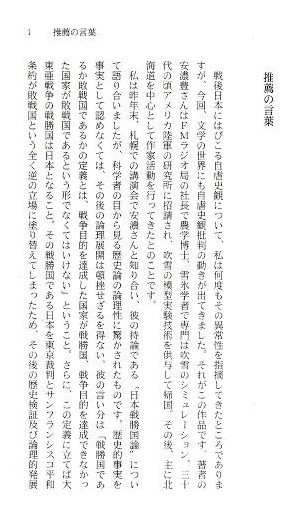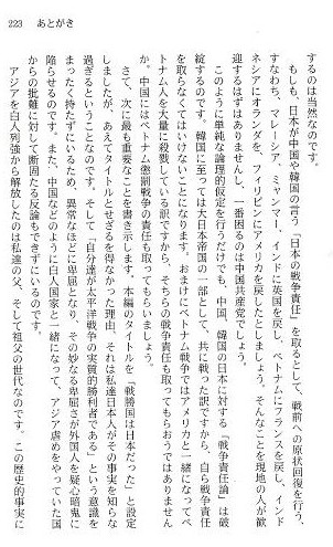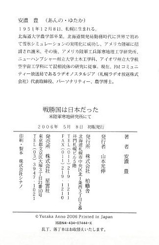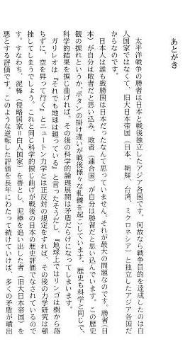 推薦の言葉 戦後日本にはびこる自虐史観について、私は何度もその異常性を指摘してきたところでありま すが、今回、文学の世界にも自虐史観批判の動きが出てきました。それがこの作品です。 著者の安濃豊さんはFMラジオ局の社長で農学博士、雪氷学者で専門は吹雪のシミュレーション、 三十代の頃アメリカ陸軍の研究所に招請され、吹雪の模型実験技術を供与して帰国。 その後、主に北海道を中心として作家活動を行ってきたとのことです。 私は昨年末、札幌での講演会で安濃さんと知り合い、彼の持論である"日本戦勝国論"につい て語り合いましたが、科学者の目から見る歴史論の論理性に驚かされたものです。歴史的事実を 事実として認めなくては、その後の論理展開は頓挫せざるを得ない。彼の言い分は「戦勝国であ るか敗戦国であるかの定義とは、戦争目的を達成した国家が戦勝国、戦争目的を達成できなかっ た国家が敗戦国であるという形でなくてはいけない」ということ。さらに、この定義に立てば大 東亜戦争の戦勝国は日本となること。その戦勝国である日本を東京裁判とサンフランシスコ平和 条約が敗戦国という全く逆の立場に塗り替えてしまったため、その後の歴史検証及び論理的発展 が混乱し、阻害されていると言うことなのです。この逆転を科学の世界で例えれば「リンゴは木 から落ちず、太陽は地球の周りを回っている」とこじつけるに等しい程の捏造なのだそうです。 さらにその混乱に拍車をかけているのが、日本人自身が持つ敗戦意識だと彼は言います。 戦勝国民であるはずの日本人自身が、自分たちは敗戦国民であると信じ切っているため、歴史感 覚の捩れがさらに捩れを生む結果となっているということです。 日本が戦勝国であることを証明 するにはさらに歴史的考察、データの積み重ねが必要となりましょうが、今回小説という形をとって、 日本戦勝国論、が発表されたことにより、日本文学に風穴を開けたのみならず、歴史学の分野にも、 日本の政治外交にも今後大きな影響を与えることになるでしょう。 まさに、この本は戦後の歴史観を塗り替える文学作品として高く評価されることになるでしょ。 黄 文雄 あとがき 太平洋戦争の勝者は日本と戦後独立したアジア各国です。何故なら戦争目的を達成したのは白 人国家ではなくて、旧大日本帝国(日本、朝鮮、台湾、ミクロネシア)と独立したアジア各国だ からなのです。 日本人は誰も戦勝国は日本だったなんて思っていません。それが最大の問題 なのです。勝者(日本)が自分は敗者だと思い込み、敗者(連合国)が自分は勝者だと思い込んで います。この歴史観の捩れというか、ボタンの掛け違いが戦後様々な軋轢を起こしています。 歴史も科学と同じで 科学的結果を捩じ曲げれば、その後の科学的論理展開は矛盾だらけになって しまいます。 ガリレオは『それでも地球は廻っている』と言ったそうだし、『地球上ではリンゴは樹から落 ちずに、空を昇って行く』とニュートン力学とは正反対の規定をすれば、その後の力学研究は頓 挫してしまうでしょう。これと同じ科学的捩じ曲げが戦後の日本の歴史評価でなされているので す。すなわち、泥棒(侵略国家H白人国家)を善とし、泥棒を追い出した者(旧大日本帝国)を 悪とする評価です。このような逆転した評価を長年にわたって続けていけば、多くの矛盾が噴出 するのは当然なのです。 もしも、日本が中国や韓国の言う「日本の戦争責任」を取るとして、 戦前への原状回復を行う、 すなわち、マレーシア、ミャンマー、インドに英国を戻し、ベトナム にフランスを戻し、インド ネシアにオランダを、フィリピンにアメリカを戻したとしましょう。 そんなことを現地の人が歓迎するはずはありませんし、一番困るのは中国共産党でしょう。 このように単純な論理的仮定を行うだけでも、中園、韓国の日本に対する「戦争責任論」は破綻 するのです。韓国に至っては大日本帝国の一部として、共に戦った訳ですから、自ら戦争責任を 取らなくてはいけないことになります。おまけにベトナム戦争ではアメリカと一緒になってベ トナム人を大量に殺戮している訳ですから、そちらの戦争責任も取ってもらおうではありませんか。 中国にはベトナム懲罰戦争の責任も取ってもらいましょう。 さて、次に最も重要なことを書き示します。本編のタイトルを「戦勝国は日本だった」と設定 しましたが、あえてタイトルとせざるを得なかった理由、それは私達日本人がその事実を知らな 過ぎるということなのです。そして「自分達が太平洋戦争の実質的勝利者である」という意識を まったく持たずにいるため、異常なほどに卑屈となり、その妙なる卑屈さが外国人を疑心暗鬼に 陥らせるのです。また、中国などのように白人国家と一緒になって、アジア虐めをやっていた国 からの批難に対して断固たる反論もできずにいるのです。 アジアを白人列強から解放したのは私達の父、そ